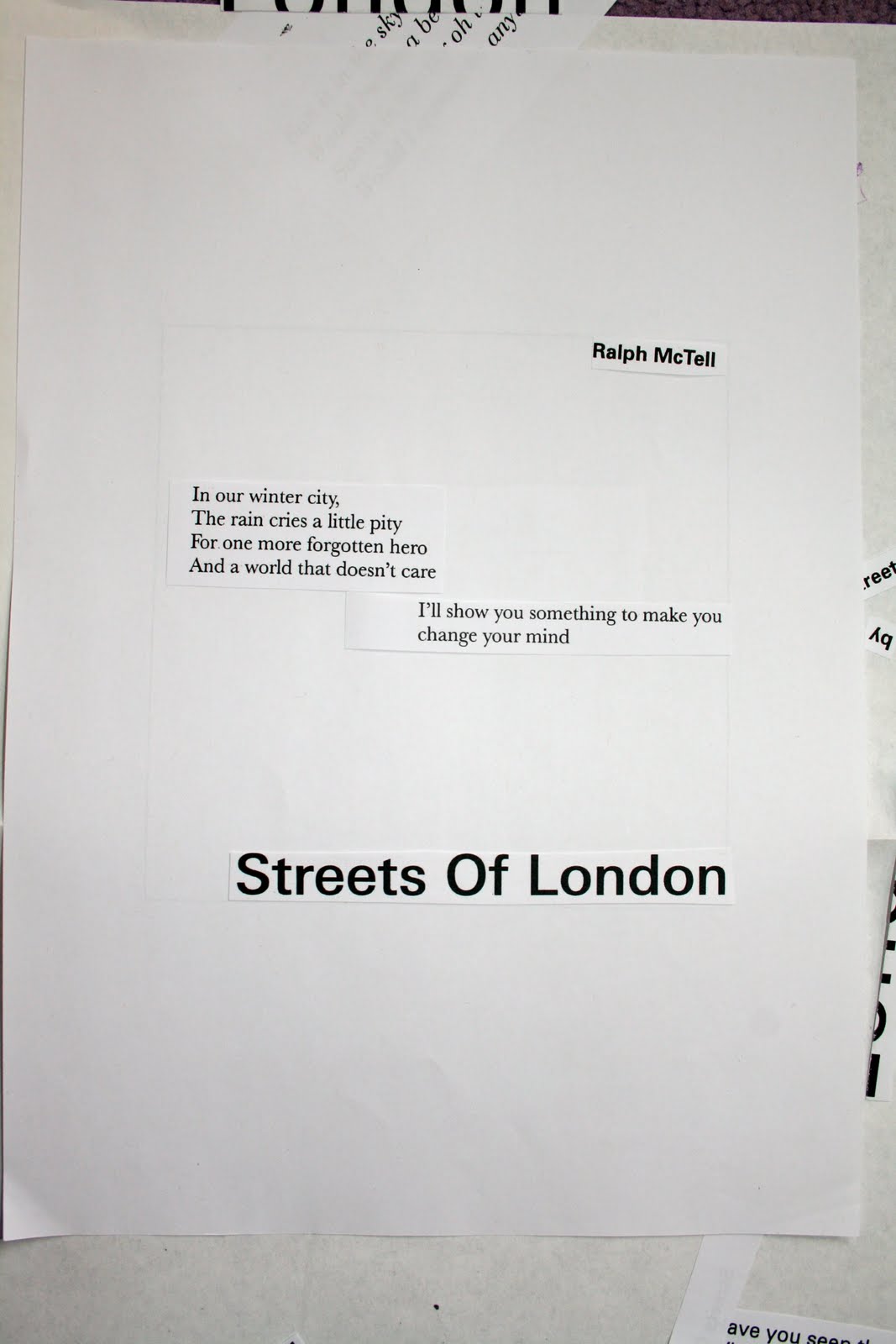 We were given the lyrics and titles to the song LDN by Lily Allen and Streets of London by Ralph McTell in various typefaces and sizes.